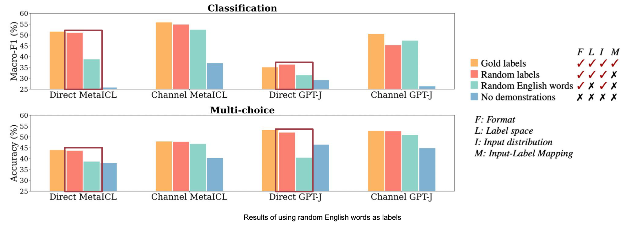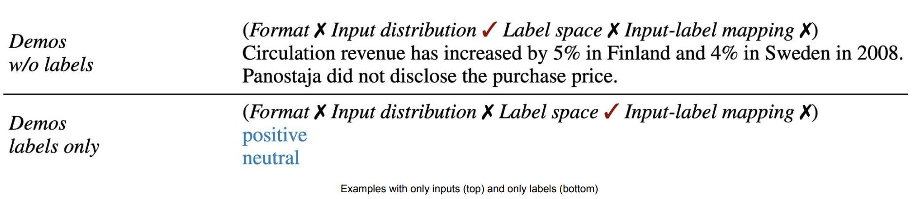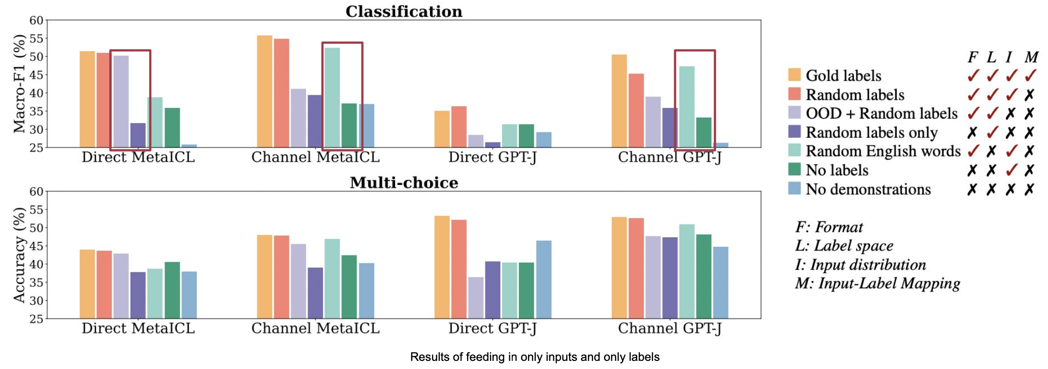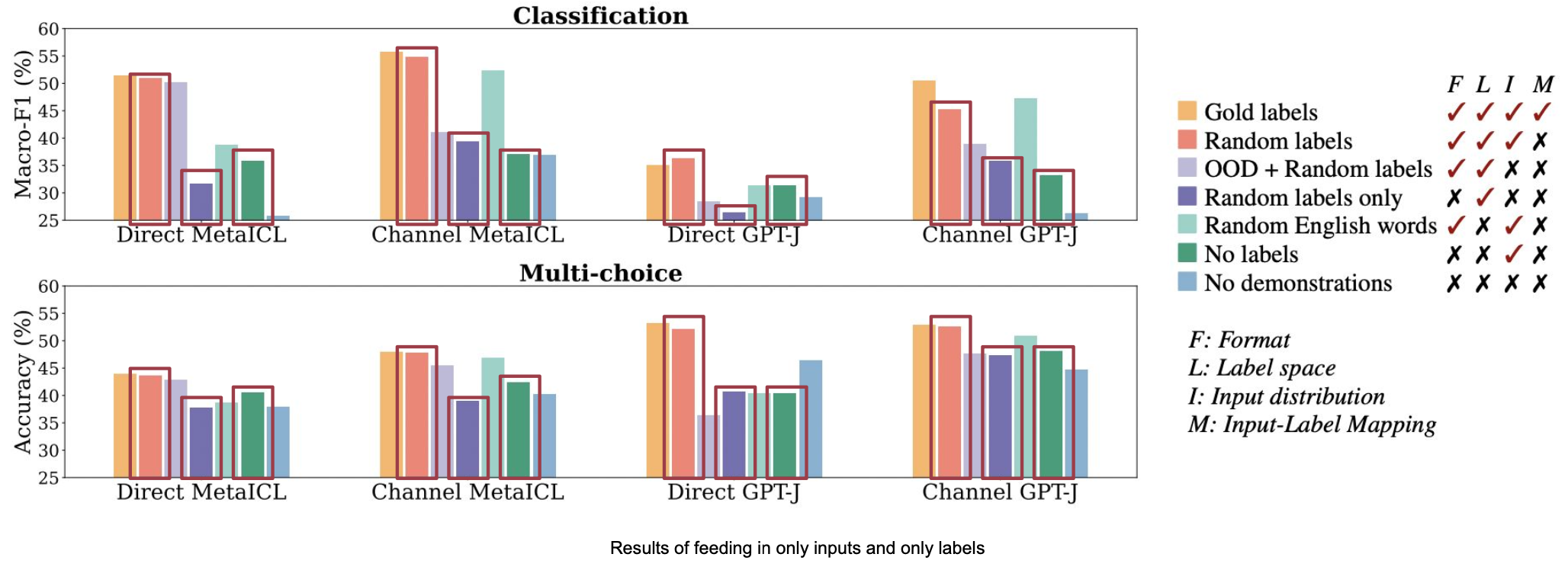 아래 그림에서 demo만 있는 경우(초록색), labels만 있는 경우(보라색)의 성능을 보면 random labels(주황색, 성능에 가장 영향이 input-output mapping이 없는 케이스)와 비교했을 때 성능이 크게 감소합니다.