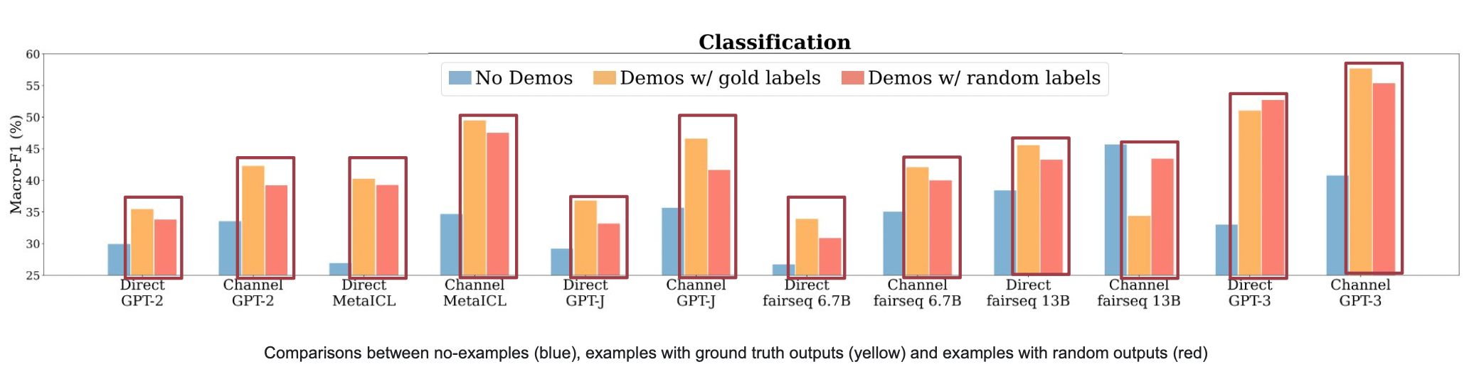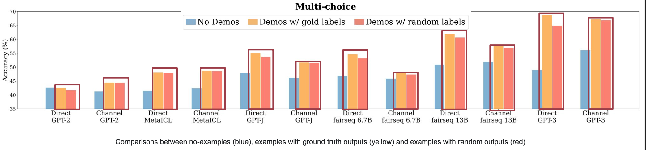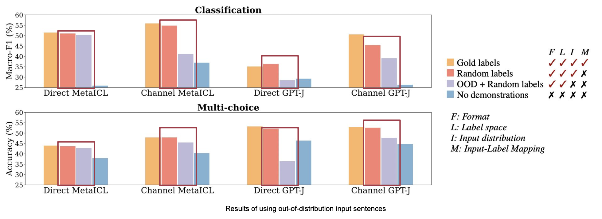 아래 그림에서 demo만 있는 경우(초록색), labels만 있는 경우(보라색)의 성능을 보면 random labels(주황색, 성능에 가장 영향이 input-output mapping이 없는 케이스)와 비교했을 때 성능이 크게 감소합니다.