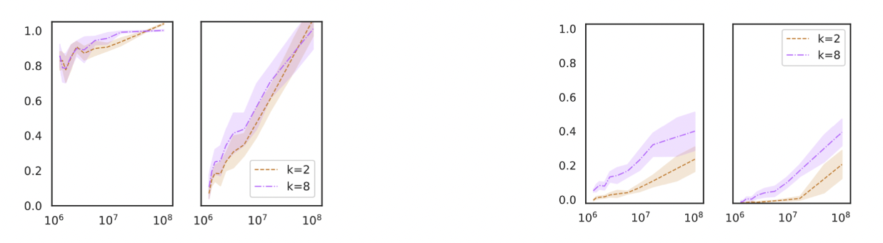 Razeghi은 numeric tasks에서 GPT-J를 평가하고 ICL 성능이 pretraining data에서 terms가 나타나는 횟수와 높은 상관관계가 있음을 확인했습니다. 아래 그림에서 x축은 term frequencies, y축은 성능을 나타냅니다. k는 example 수를 의미합니다. 왼쪽부터 덧셈, 곱셈, 프롬프트에 작업 표시가 없는 덧셈, 프롬프트에 작업 표시가 없는 곱셈입니다.