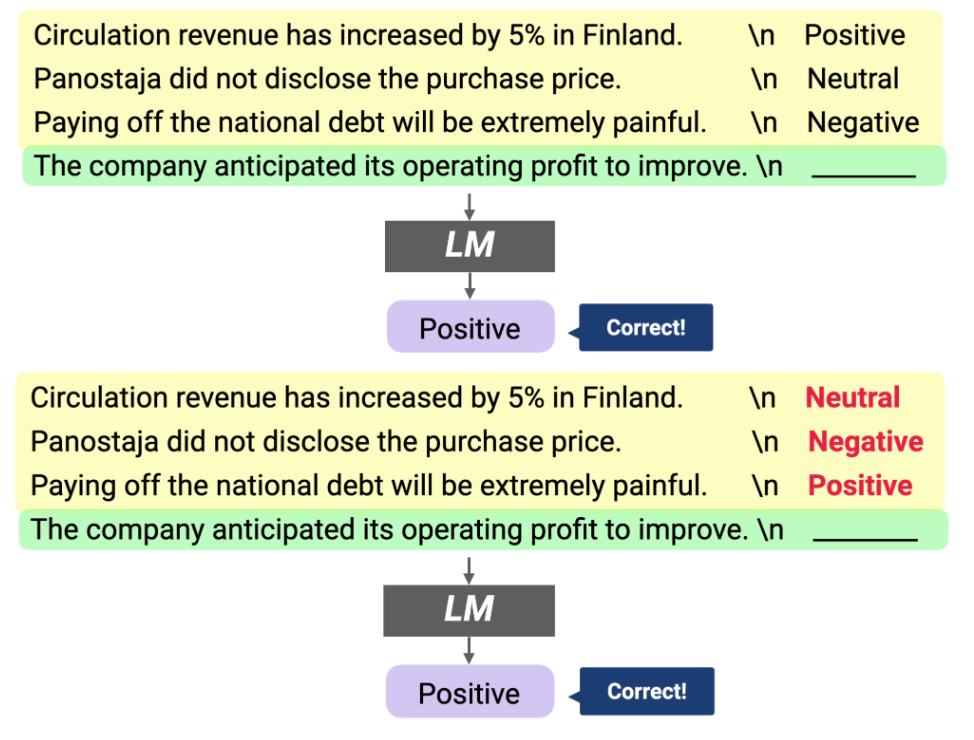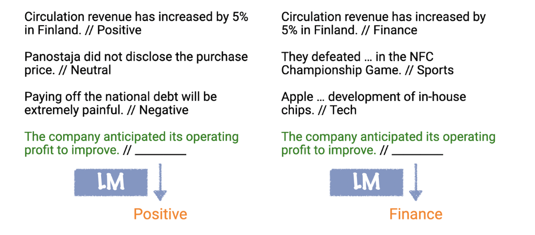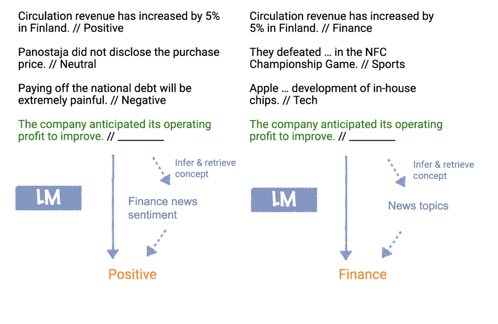 이미지를 보면 학습 예제(prompt)들을 이용해서 Sentiment Analysis인지 Topic Classification인지 알아내고, test input에 같은 형식을 mapping 합니다.