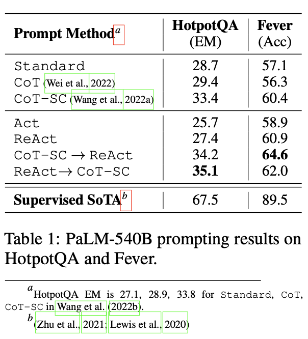 - 표 1은 다양한 프롬프트 방식과 함께 PaLM- 540B를 기본 모델로 사용한 HotpotQA 및 Fever 결과를 보여줍니다.