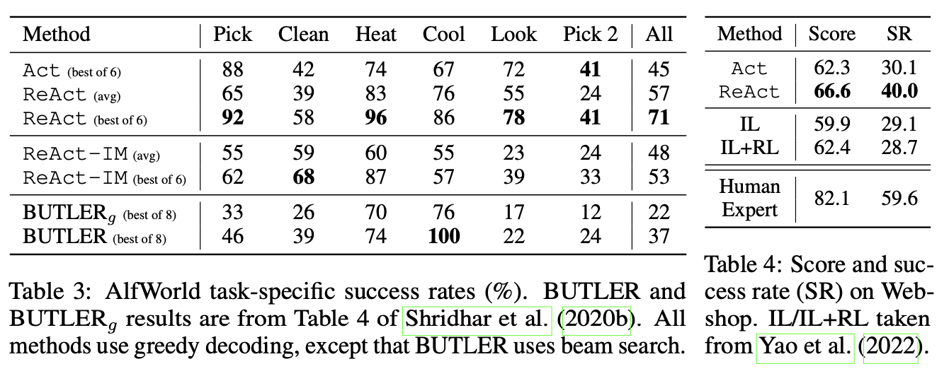 또한 언어 기반 대화형 의사 결정 과제인 ALFWorld와 WebShop에서 ReAct를 테스트했는데, 두 과제 모두 에이전트가 보상이 적고 긴 시간 동안 행동해야 하는 복잡한 환경으로, 효과적으로 행동하고 탐색하기 위해 추론이 필요함을 알 수 있었습니다.