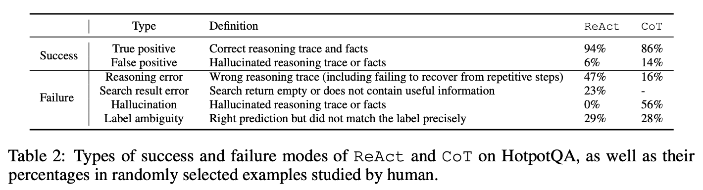 - HotpotQA에서 ReAct와 CoT의 행동 차이를 더 잘 이해하기 위해, 우리는 ReAct와 CoT에서 각각 정답과 오답(EM이 판단)이 있는 궤적 50개(따라서 총 200개)를 무작위로 샘플링하고 표 2에서 성공 및 실패 모드에 수동으로 레이블을 지정했습니다.