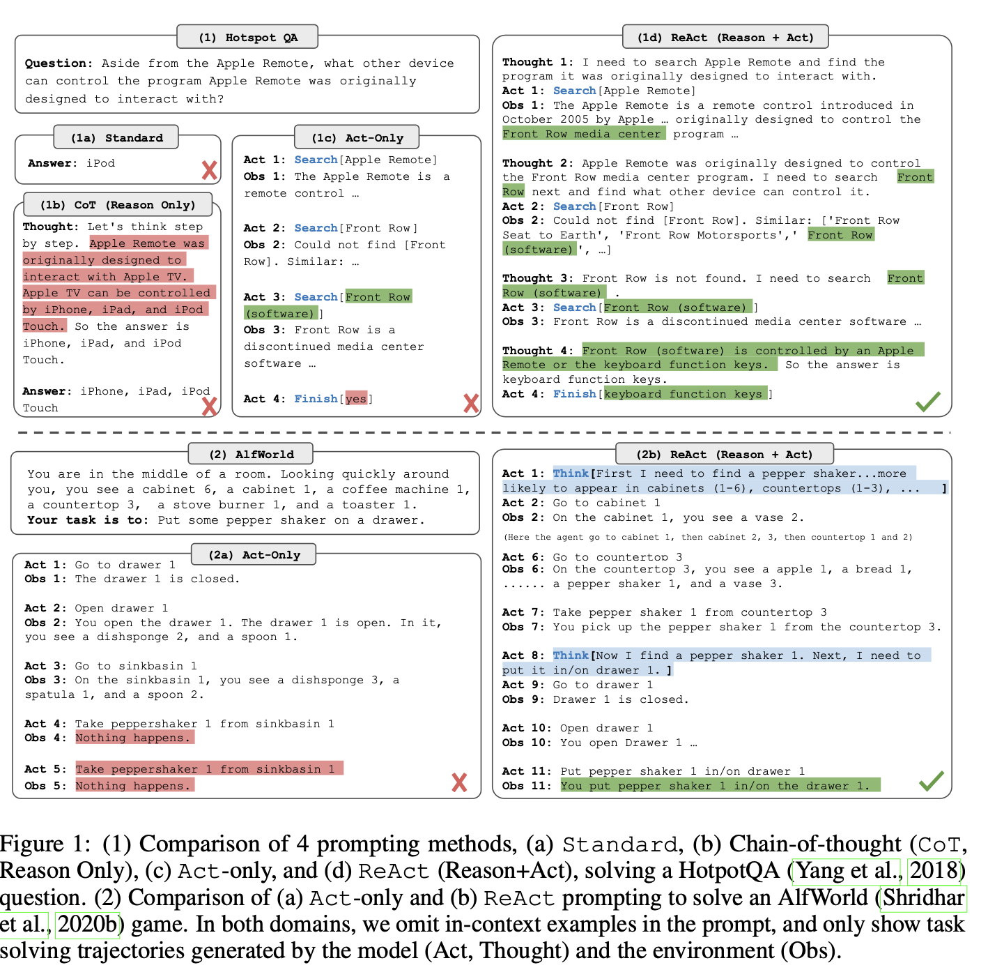 - 표준 프롬프트(Standard)는 ReAct 궤적에서 모든 생각, 행동, 관찰을 제거