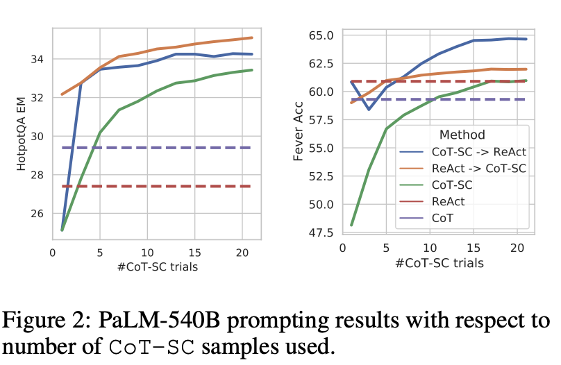 - CoT-SC → ReAct: n개의 CoT-SC 샘플 중 다수의 답변이 n/2회 미만인 경우(즉, 내부 지식이 해당 작업을 확실하게 지원하지 못할 수 있음), ReAct로 백오프합니다.