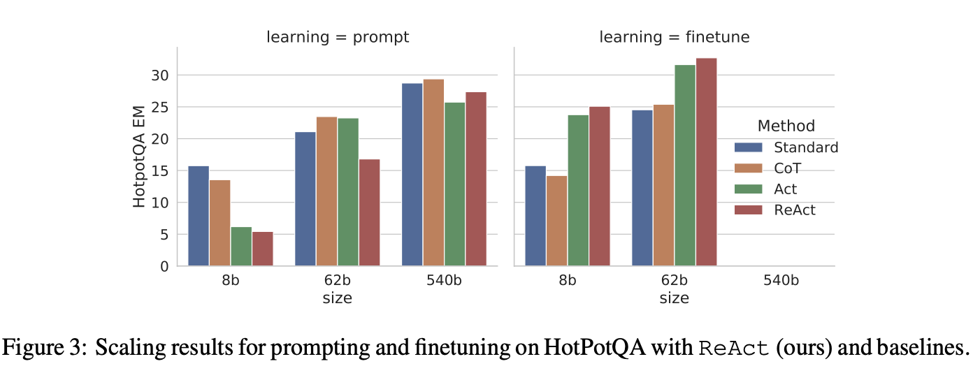 - PaLM-8/62B를 사용하면 맥락에 맞는 예제에서 추론과 행동을 모두 학습하기 어렵기 때문에 ReAct 프롬프트의 성능이 네 가지 방법 중 가장 떨어집니다.
